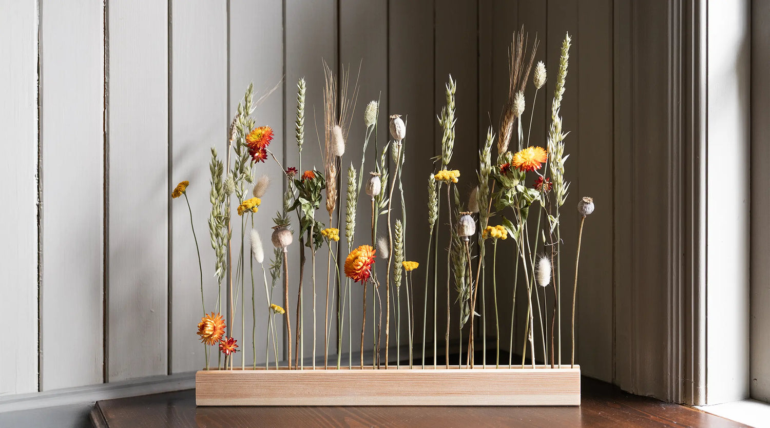 Blomlist Autumn Glow med torkade blommor i varma hösttoner av orange och gult. En vacker inredningsdetalj som också passar som gåva! Exempel på blommor som kan ingå är eterneller, vallmo och sädesslag. Häng blomlisten på väggen, ställ den på bordet eller använd den som ett dekorativt insynsskydd i fönstret. Listen finns i tre storlekar och levereras direkt hem till dörren.